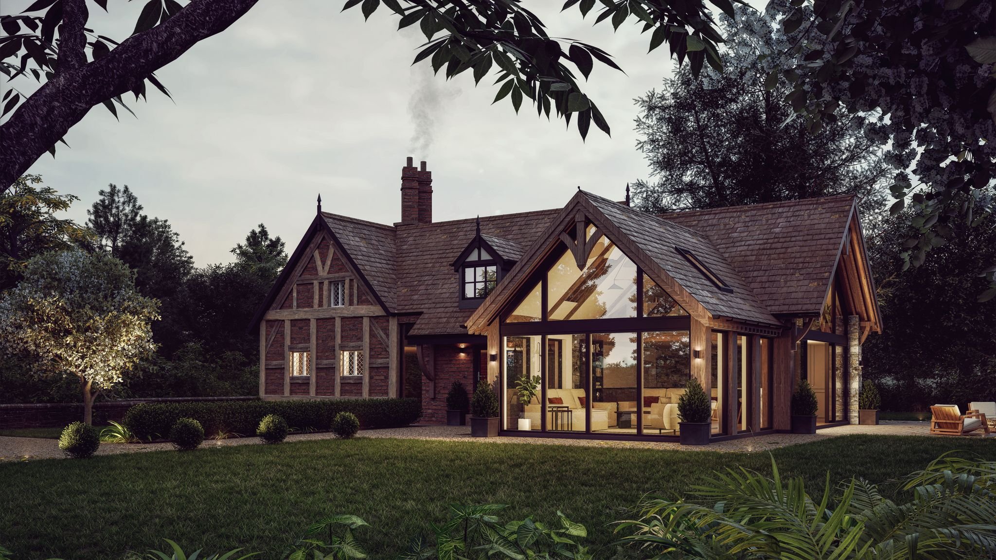 Keepers Cottage is a traditional Cheshire country home set within beautiful rural surroundings. A sympathetic oak-frame extension preserves its heritage character while introducing contemporary family living, seamlessly connected to the landscape.